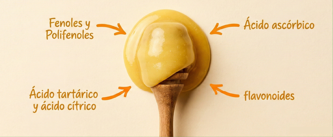 - Ácidos orgánicos (tartárico y cítrico): forman parte de la composición natural de la miel y se relacionan con propiedades antioxidantes y antiinflamatorias, contribuyendo al “ecosistema” bioactivo del Ulmo.