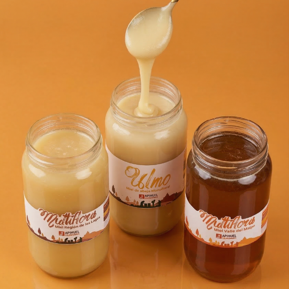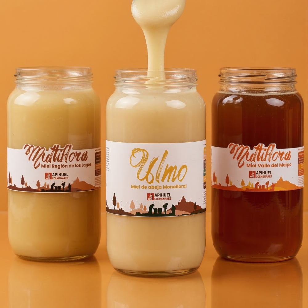 Cada frasco es de 1.3kg y contiene miel cosechada por nuestras abejas en distintos rincones de Chile, envasada en origen y presentada en vidrio para conservar intacto su aroma, textura y sabor.